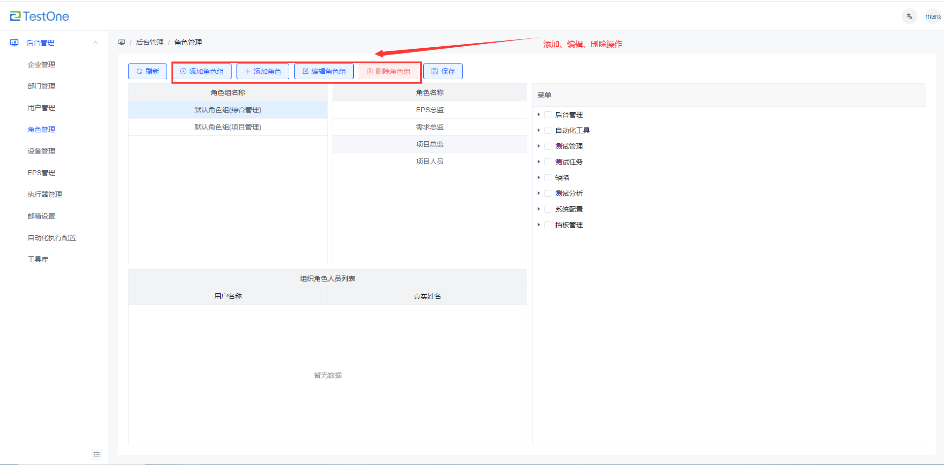 進(jìn)行角色組和角色的添加編輯以及刪除操作,該功能是為了給項(xiàng)目其他用戶分配權(quán)限,系統(tǒng)默認(rèn)的角色包括EPS總監(jiān)、需求總監(jiān)、項(xiàng)目總監(jiān)、項(xiàng)目人員、測試工程師、EPS負(fù)責(zé)人、開發(fā)負(fù)責(zé)人、開發(fā)工程師等。 |