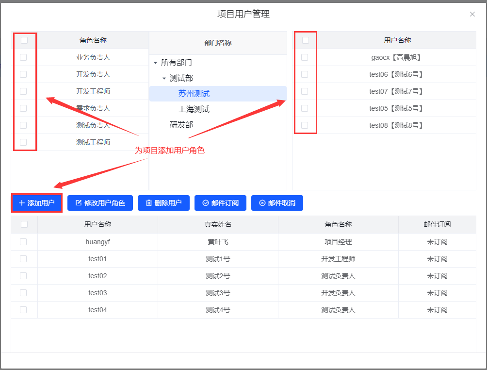 1. 勾選未關(guān)聯(lián)的用戶(待加入項(xiàng)目的用戶) 2. 選擇項(xiàng)目角色 3. 勾選功能列表(用戶權(quán)限) 4. 點(diǎn)擊加入用戶,即可成功添加。 |