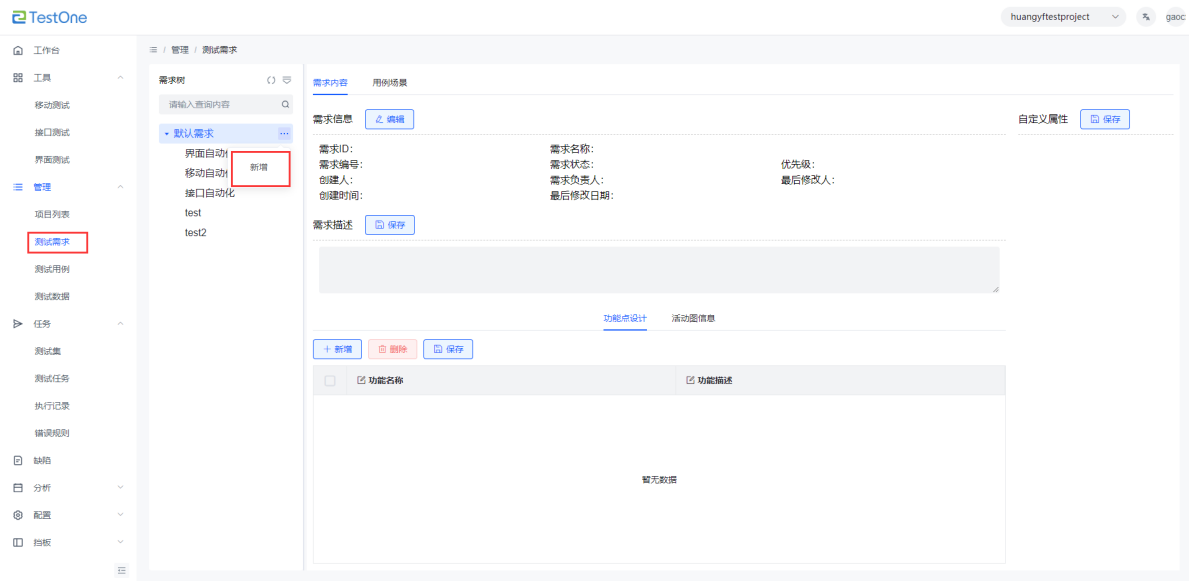 點擊進行測試需求的新建 |