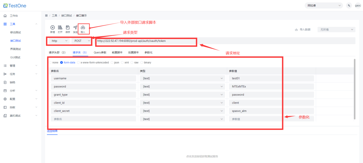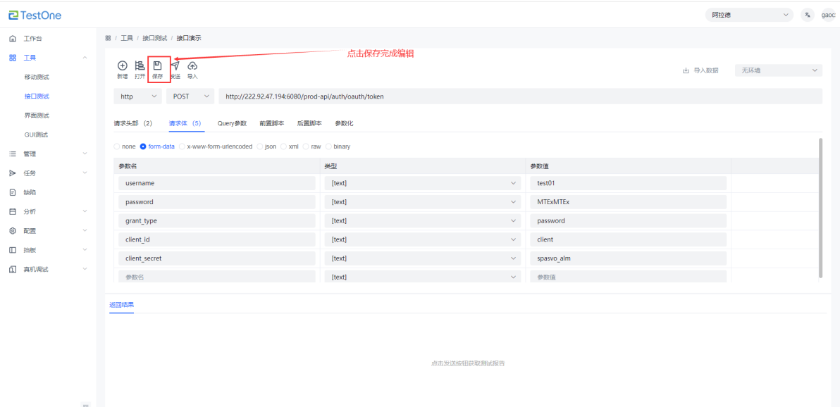 1.選擇接口請求類型 2.輸入接口請求地址; 3.編輯接口請求攜帶參數(shù) 4.點擊保存,接口組件編輯完成 |