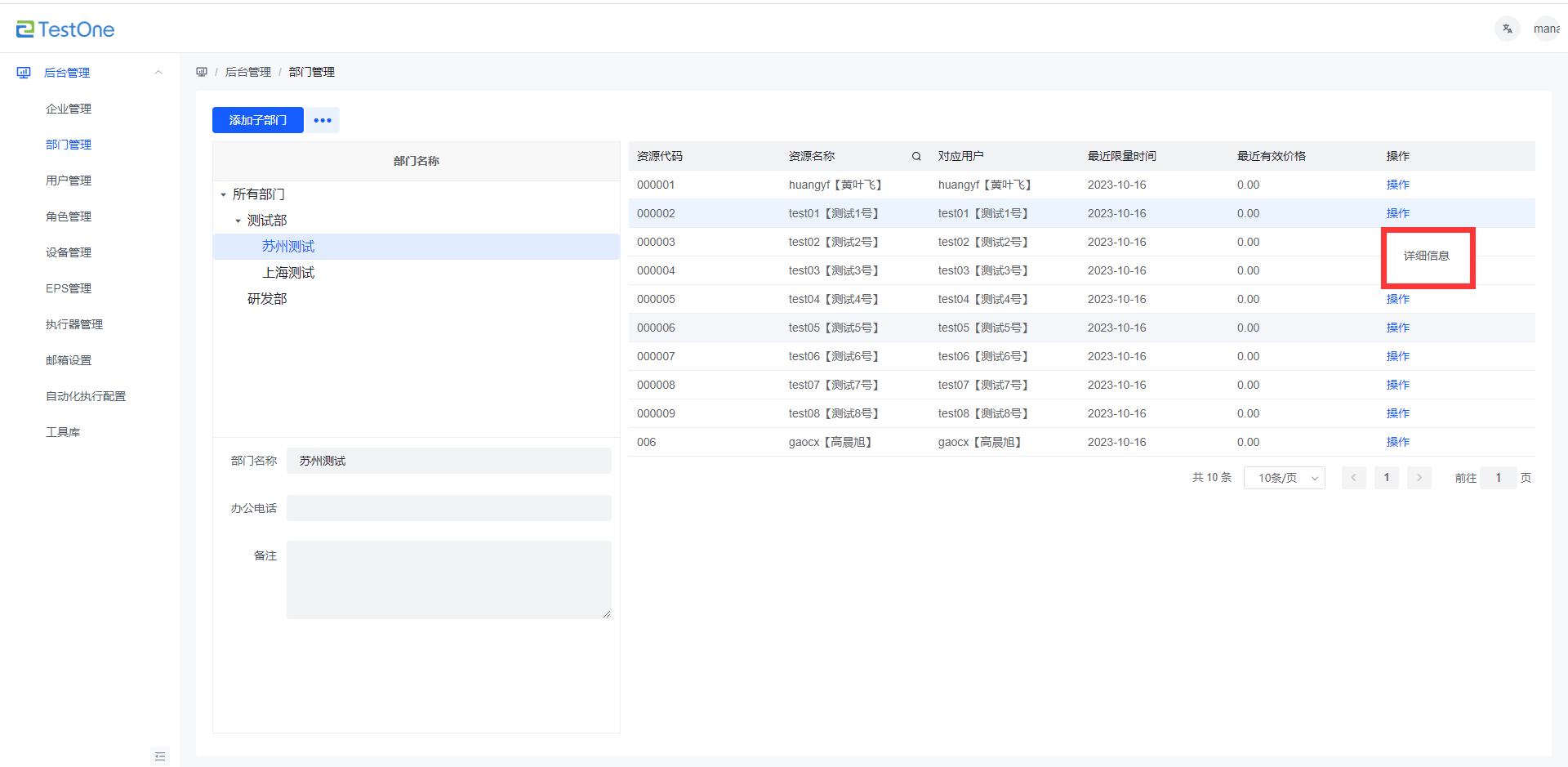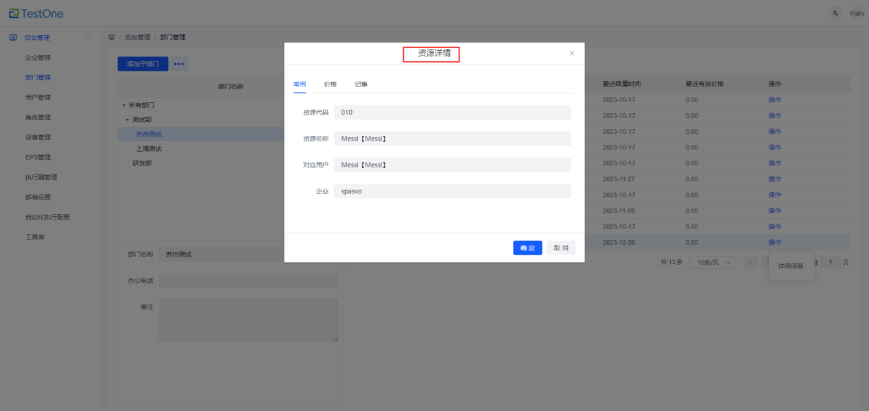 選中需要查看的資源的操作按鈕,點擊【詳情信息】按鈕,可查看該資源的常用、價格以及記事信息。