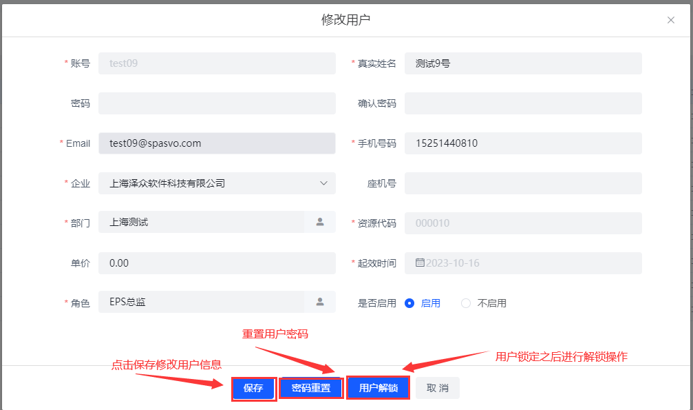 選中需要修改的用戶,點擊【編輯】按鈕,可修改用戶的基本信息,重置密碼則可將用戶密碼重置為Password123,用戶密碼鎖定可以通過用戶解鎖操作進行解鎖。