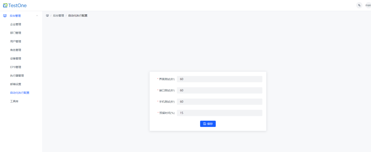進(jìn)入【自動化執(zhí)行配置】,這里主要對自動化執(zhí)行進(jìn)行配置(配置界面測試,接口測試,手機(jī)測試,預(yù)留時間)。
