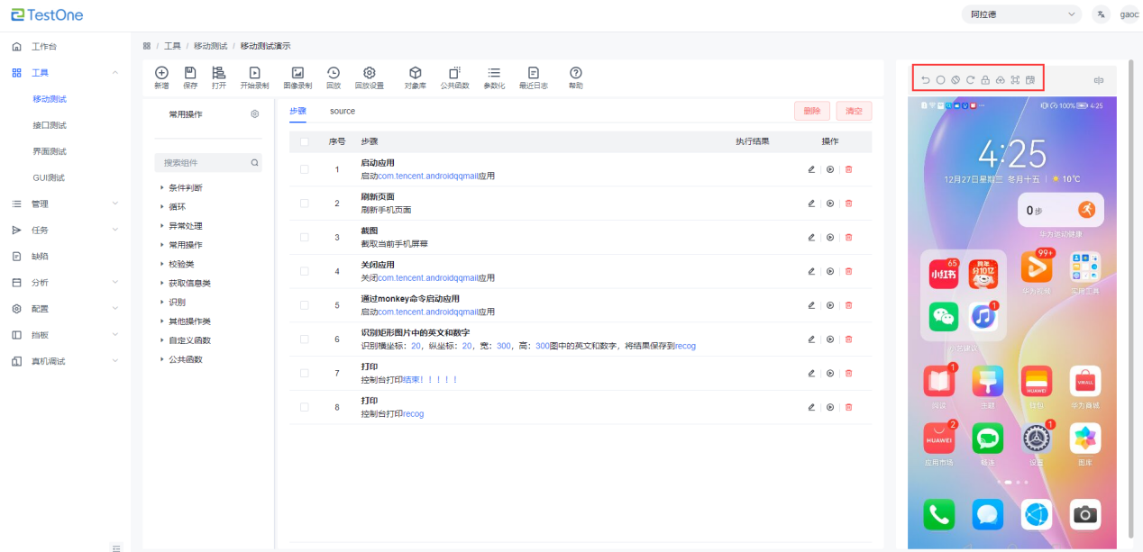 移動測試調(diào)用手機(jī)遠(yuǎn)程調(diào)試支持手機(jī)虛擬鍵:“返回鍵”“Home鍵”“多任務(wù)鍵”以及支持操作手機(jī)鎖屏、上傳apk、截圖等操作。