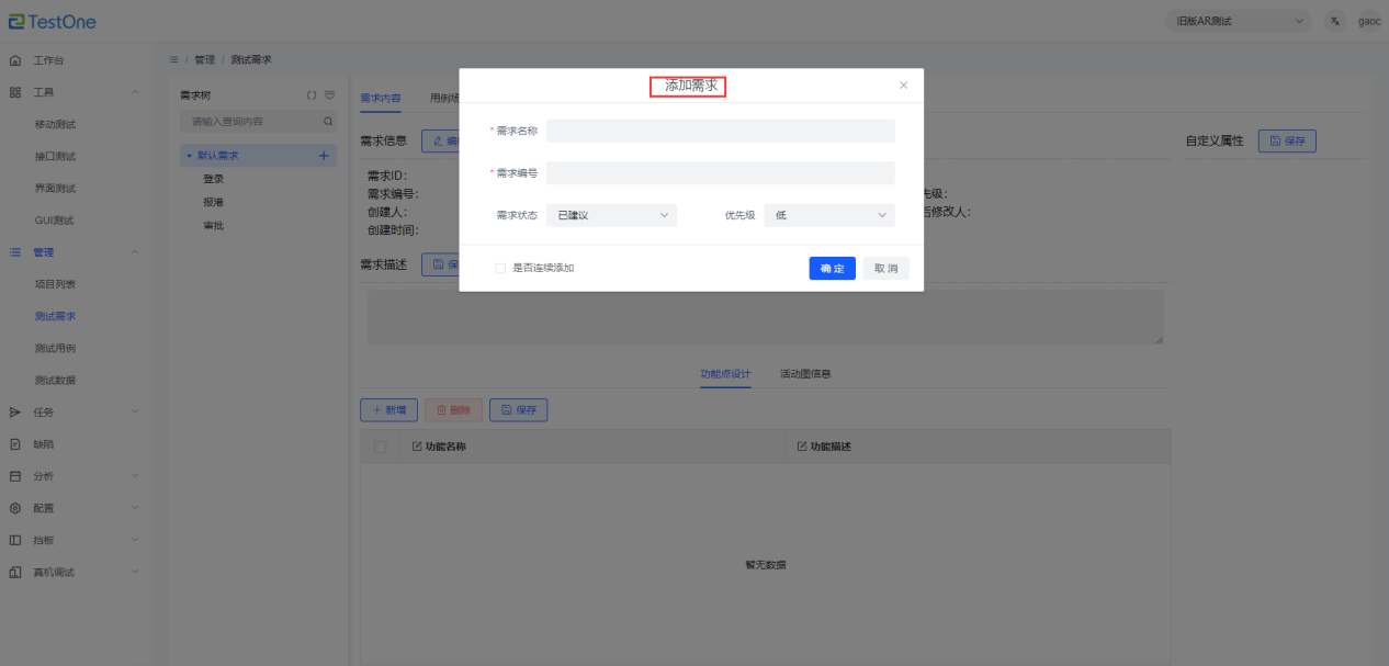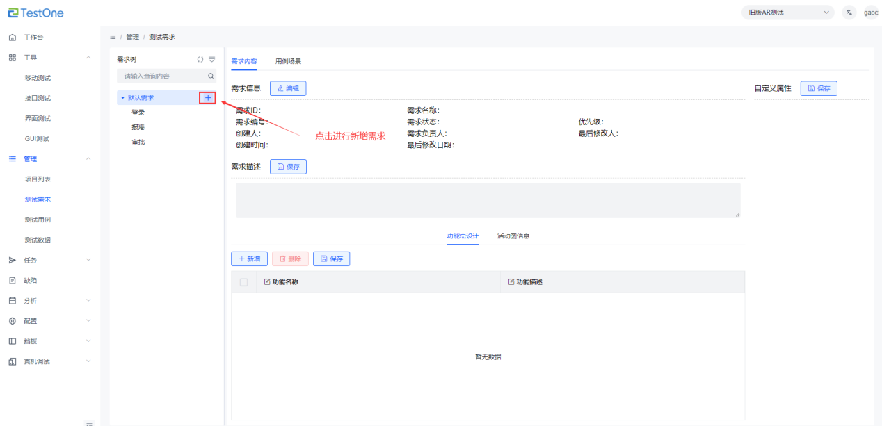 【管理】-【測(cè)試需求】進(jìn)入需求模塊,進(jìn)行創(chuàng)建需求操作