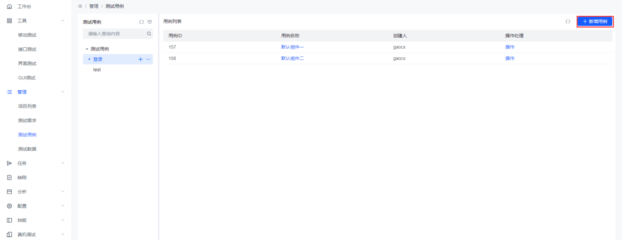 選擇一個(gè)用例組件后,在用例管理模塊,點(diǎn)擊【新增用例】按鈕可以新增用例。