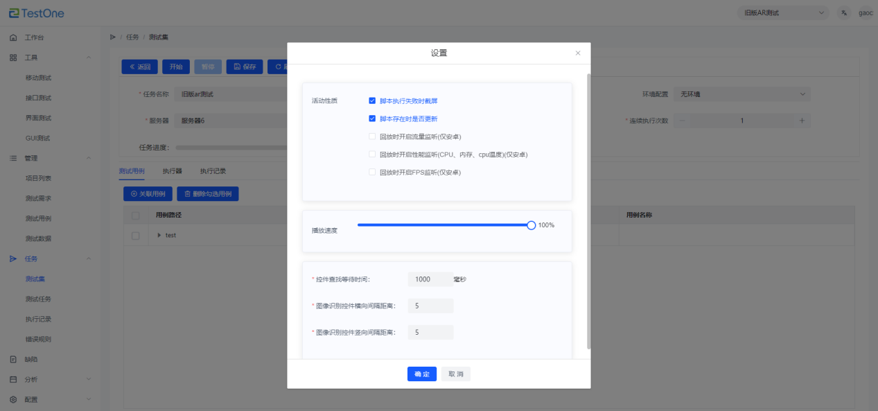 點擊【設(shè)置】按鈕,可以在任務(wù)集執(zhí)行過程中進行流量監(jiān)聽、性能監(jiān)聽、FPS監(jiān)聽、以及在失敗時進行截圖。也可以調(diào)節(jié)播放速度、查找等待時間、圖像識別控件橫向間隔距離、圖像識別控件豎向間隔距離。
