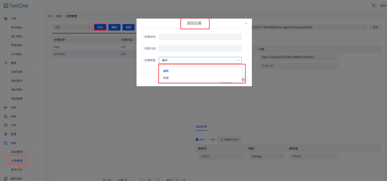 進(jìn)入【擋板】-【交易管理】,選擇創(chuàng)建的系統(tǒng)管理,點(diǎn)擊【添加】,新增交易,交易類型有接收和發(fā)送