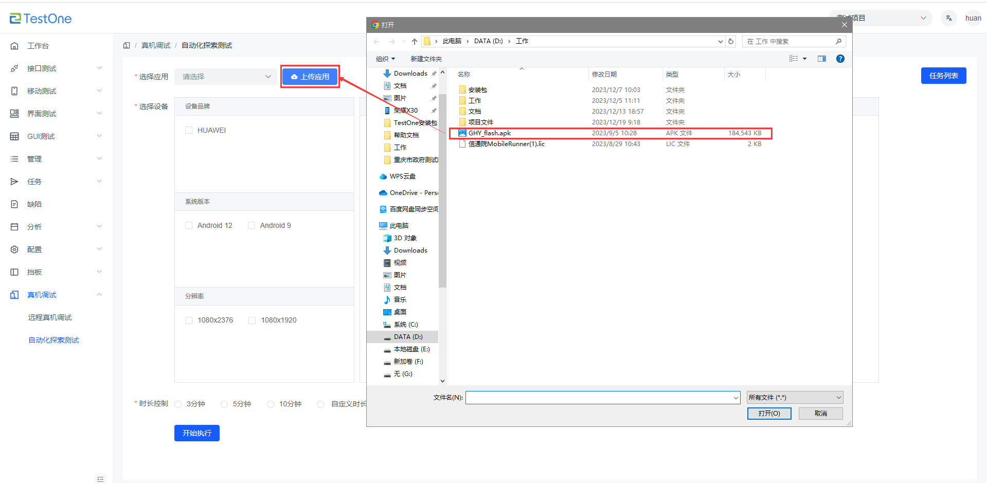 點(diǎn)擊上傳應(yīng)用,可彈出選擇應(yīng)用窗口,選擇應(yīng)用后等待上傳完成進(jìn)度,即可在點(diǎn)擊【上傳應(yīng)用】按鈕下看到上傳的應(yīng)用。