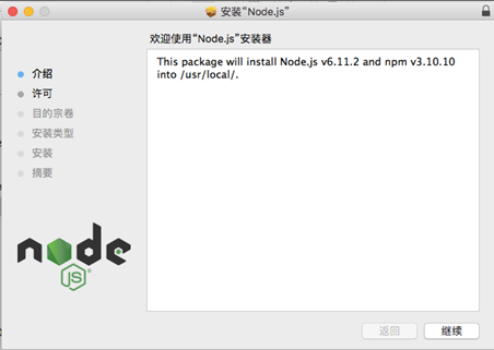 打開MRForMac.zip解壓后目錄下的node-v6.11.2.pkg進行安裝,或直接到官網下載安裝。