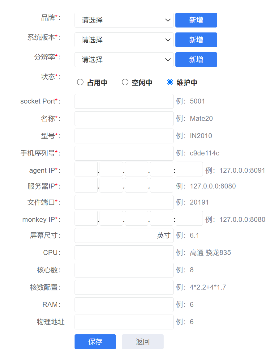 1)支持手機設(shè)備信息的新增、修改、刪除; 2)支持批量修改手機狀態(tài):占用中、空閑中、維護中; |