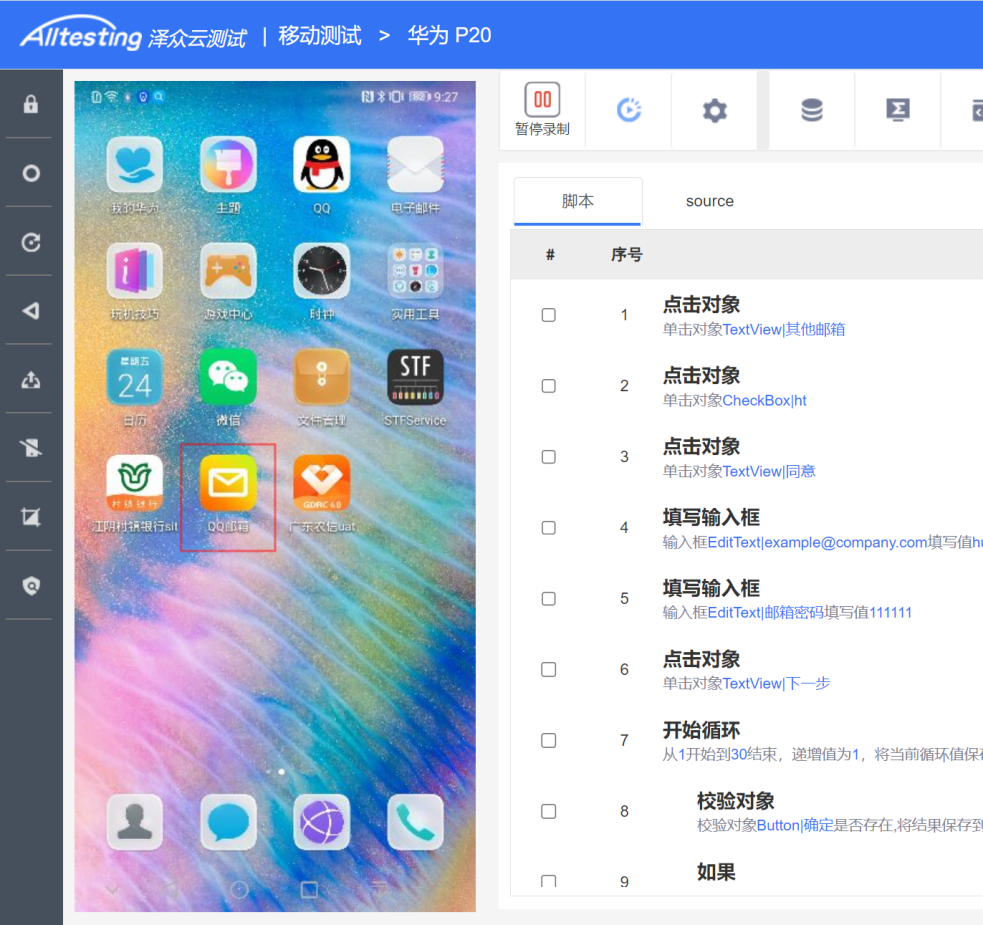 腳本錄制: 1)點(diǎn)擊【錄制按鈕】,開啟錄制; 2)在左側(cè)手機(jī)屏幕上操作,右側(cè)腳本區(qū)自動(dòng)記錄操作; |