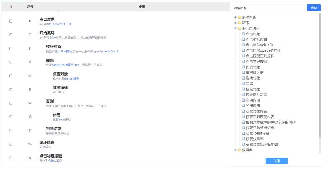 1)通過(guò)拖拽腳本語(yǔ)句,生成自然語(yǔ)言命令; 2)通過(guò)上下拖動(dòng)腳本語(yǔ)句,調(diào)節(jié)執(zhí)行順序; 3)通過(guò)左右拖動(dòng)腳本語(yǔ)句,設(shè)置循環(huán)、判斷、異常處理等命令作用域; |
