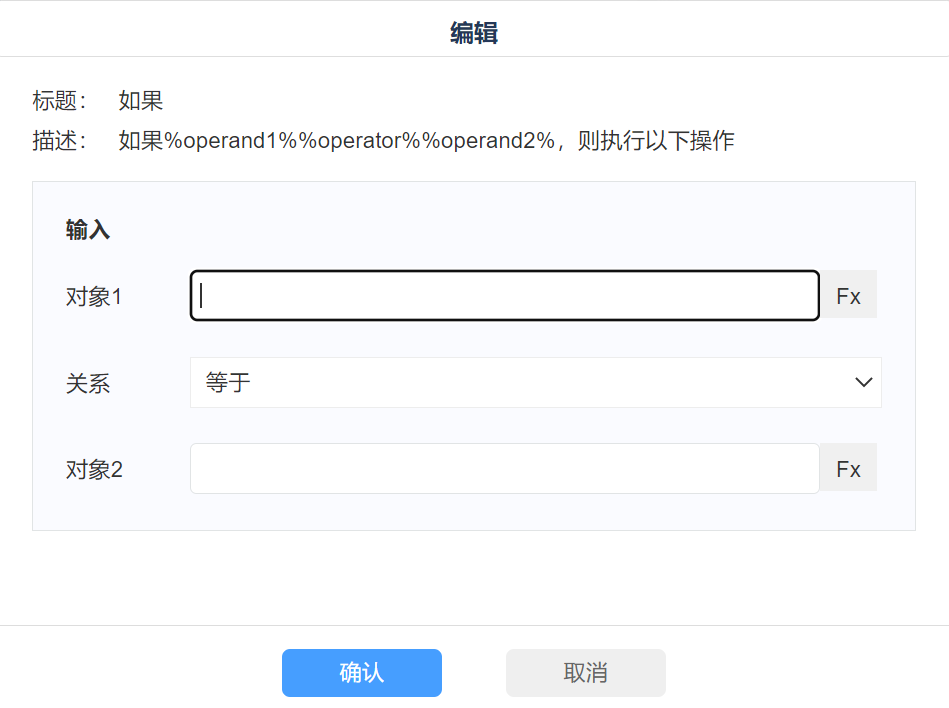 1)配置對象1; 2)選擇關(guān)系; 3)配置對象2,當(dāng)關(guān)系為“等于True”、“等于False”時無需選擇; |