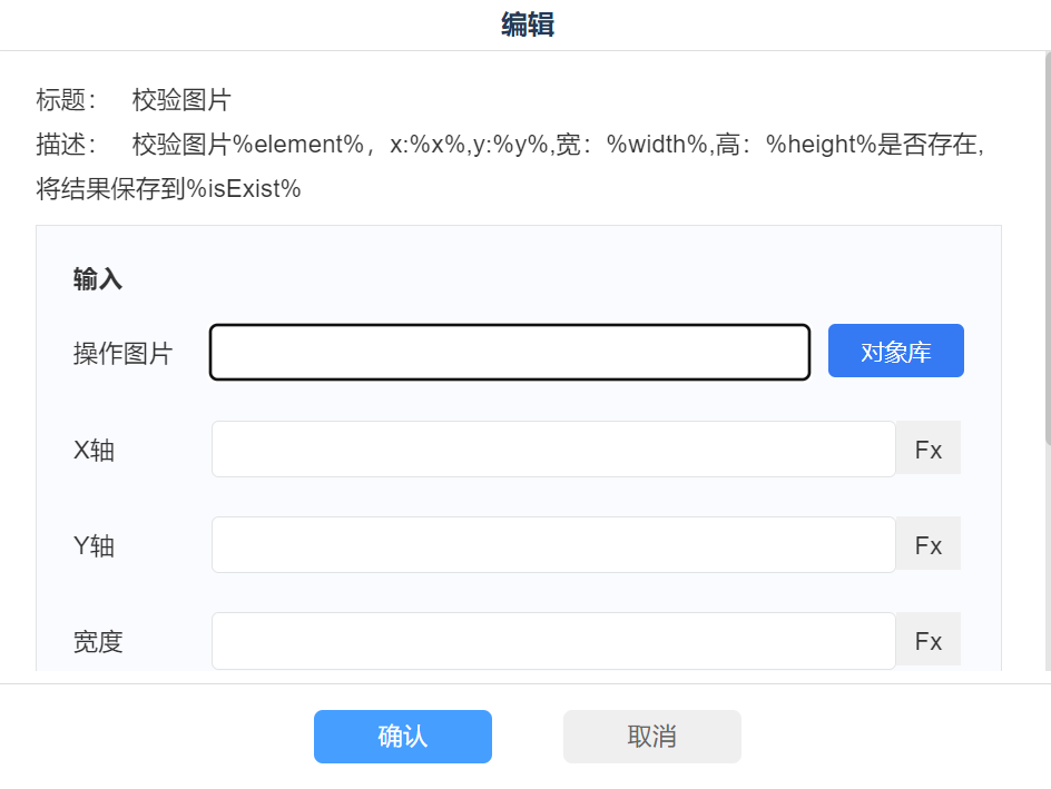 1)通過【對(duì)象庫】選擇校驗(yàn)對(duì)象 2)輸入/選擇頁面需要校驗(yàn)矩形區(qū)域圖片的橫坐標(biāo)、縱坐標(biāo)、寬度、高度; 3)定義輸出參數(shù)名稱 |