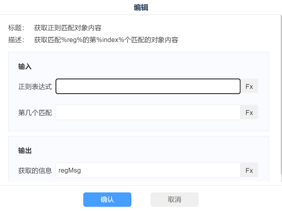 1)輸入/選擇正則表達(dá)式; 2)輸入/選擇匹配第幾個(gè); 3)定義輸出參數(shù)名稱; |