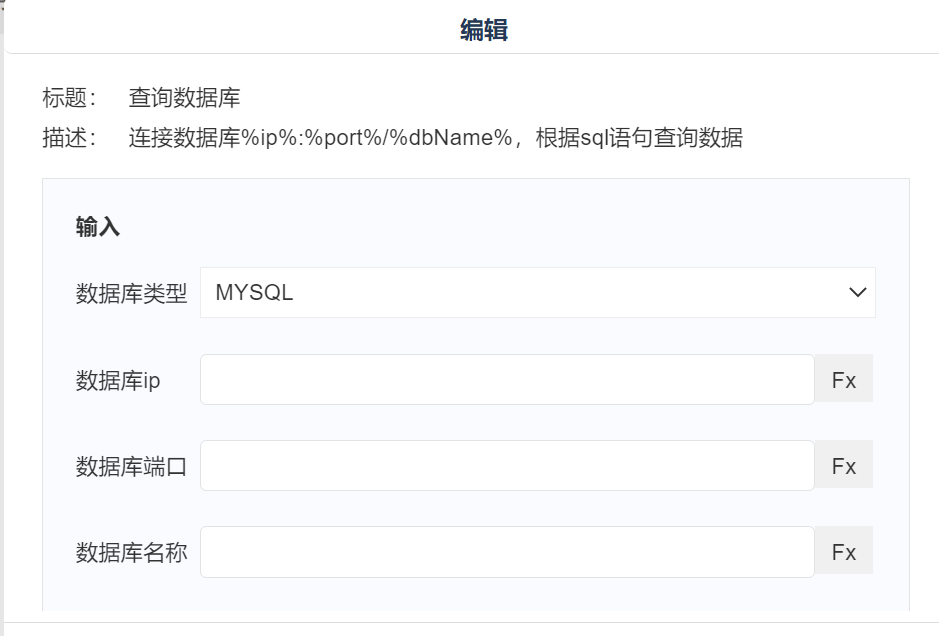 1)選擇數(shù)據(jù)庫類型; 2)輸入/選擇數(shù)據(jù)庫地址; 3)輸入/選擇數(shù)據(jù)庫用戶名; 4)輸入/選擇數(shù)據(jù)庫密碼; 5)輸入查詢語句; 6)輸入/選擇期望值; 7)定義輸出參數(shù)名稱; |